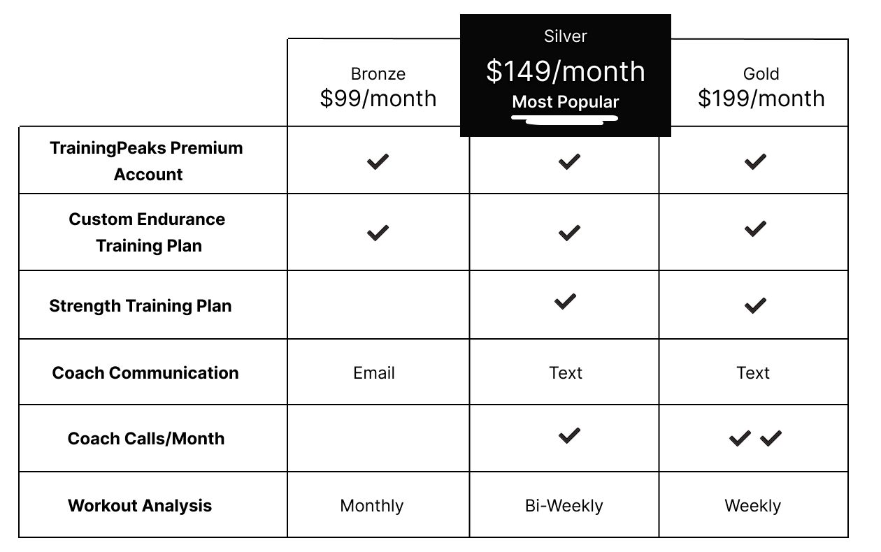 We provide remote strength and endurance training programs for active adults and youth athletes. Monthly coaching starts at $99/month and includes a Premium TrainingPeaks account, workout analysis, and athlete discounts. Our training plans are built based on your preference of RPE, wattage, or HR to fit seamlessly into your routine.